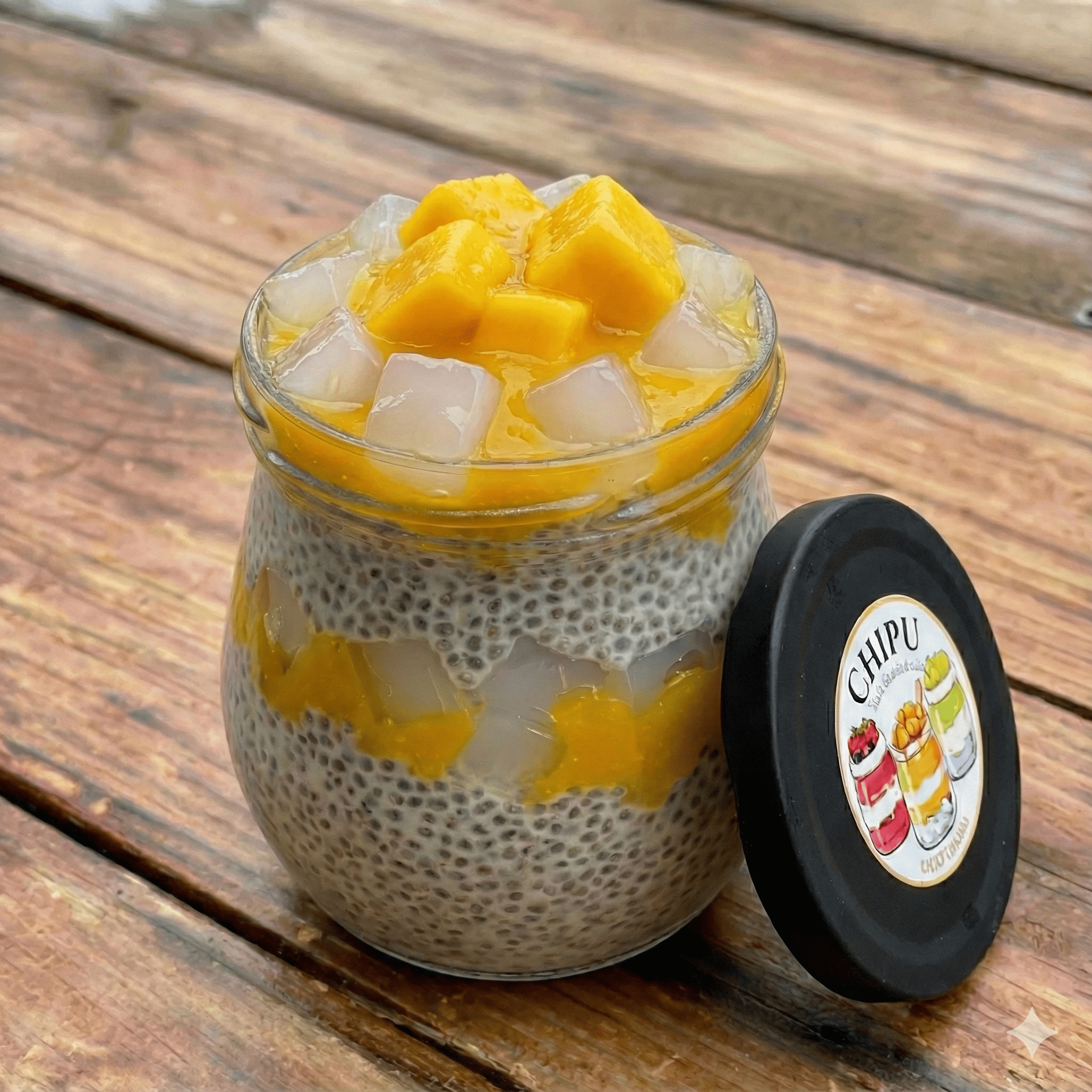 Chia Pudding With Topping Nata de Coco and mango